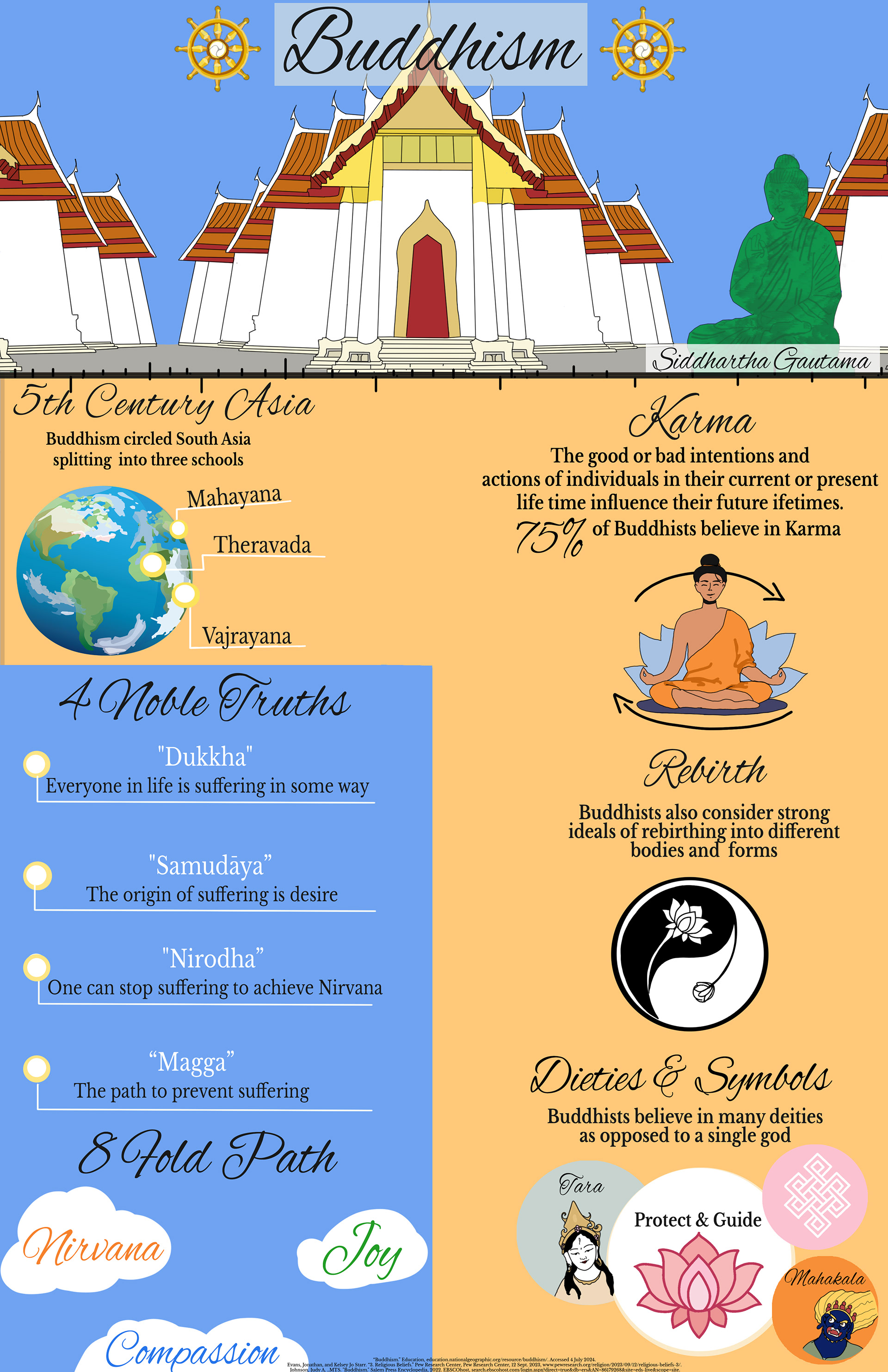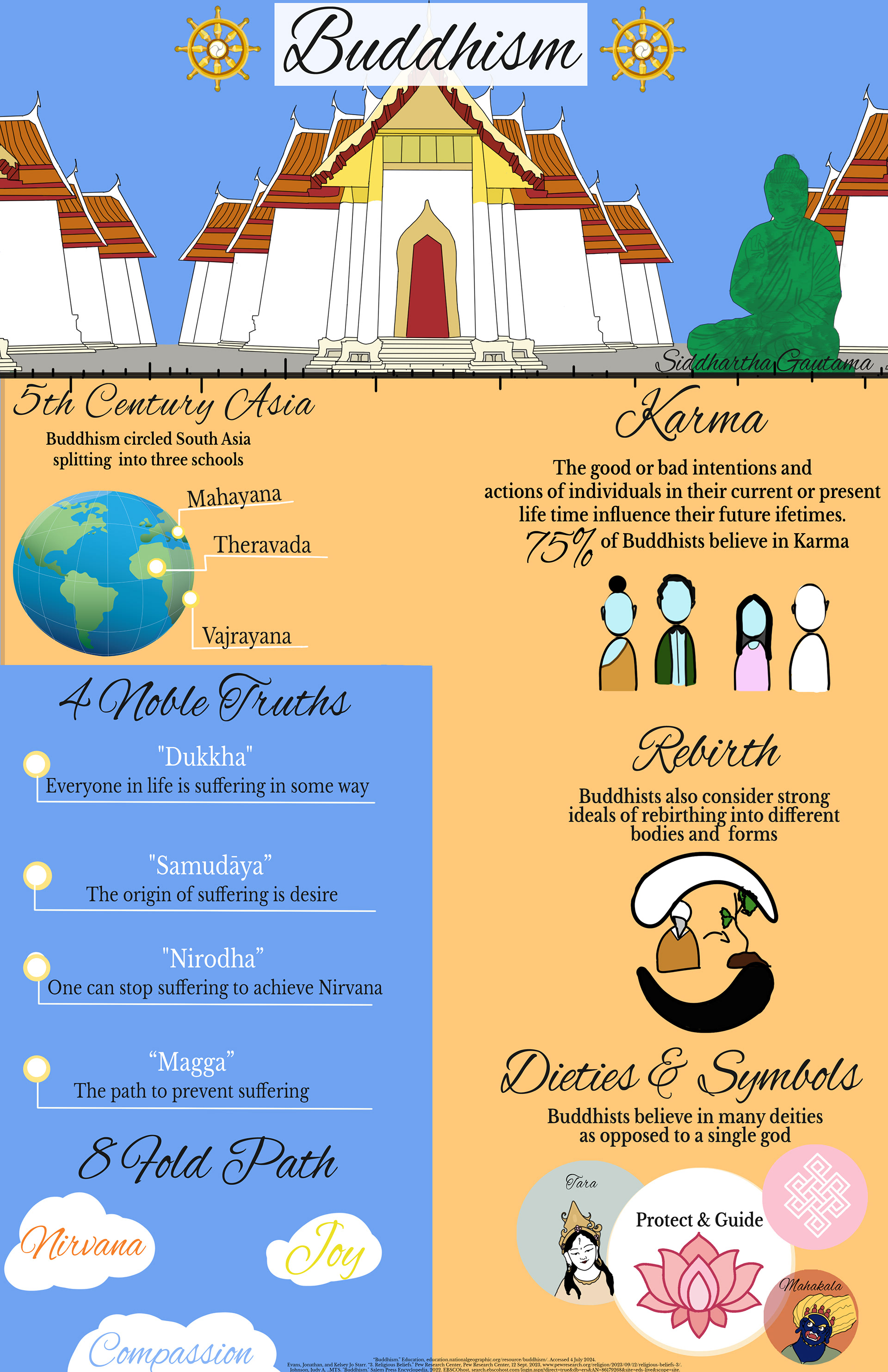 To start, I began with gathering resources and infographics to study how information was displayed through various means (images, pictographs, charts, and so forth). I also began compiling symbols, figures, typography choices, and other information of Buddhism.