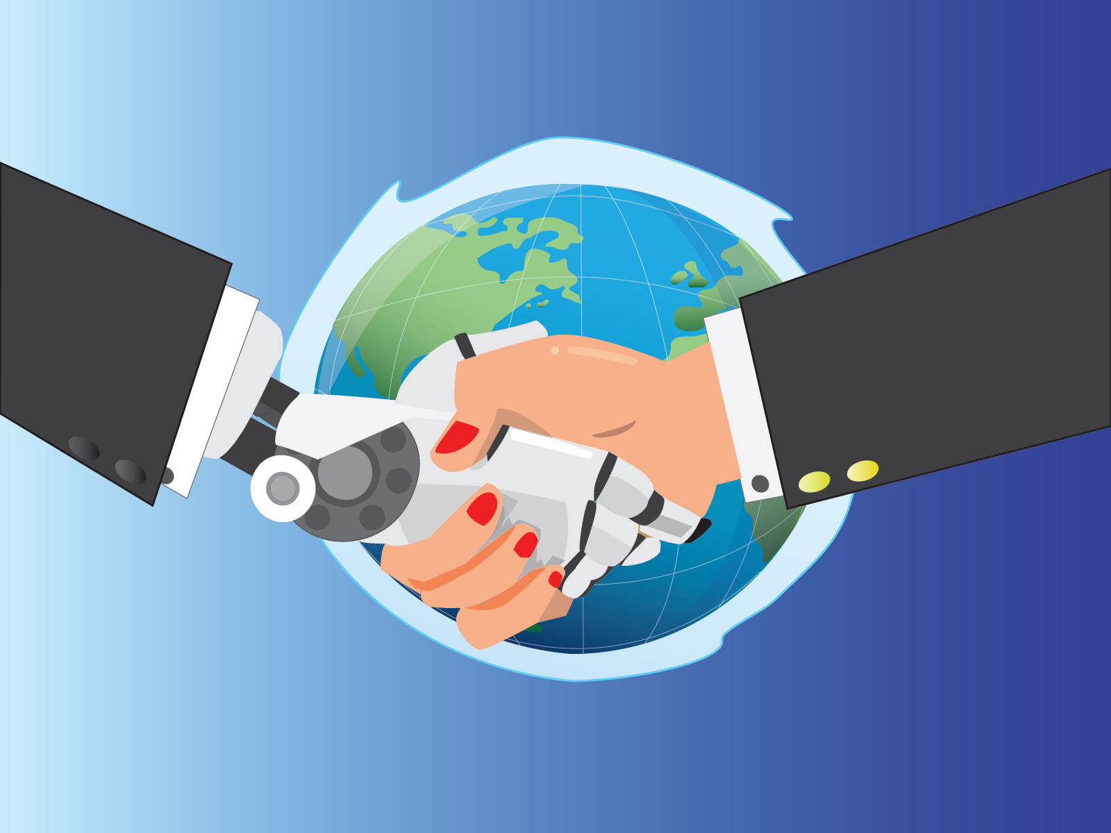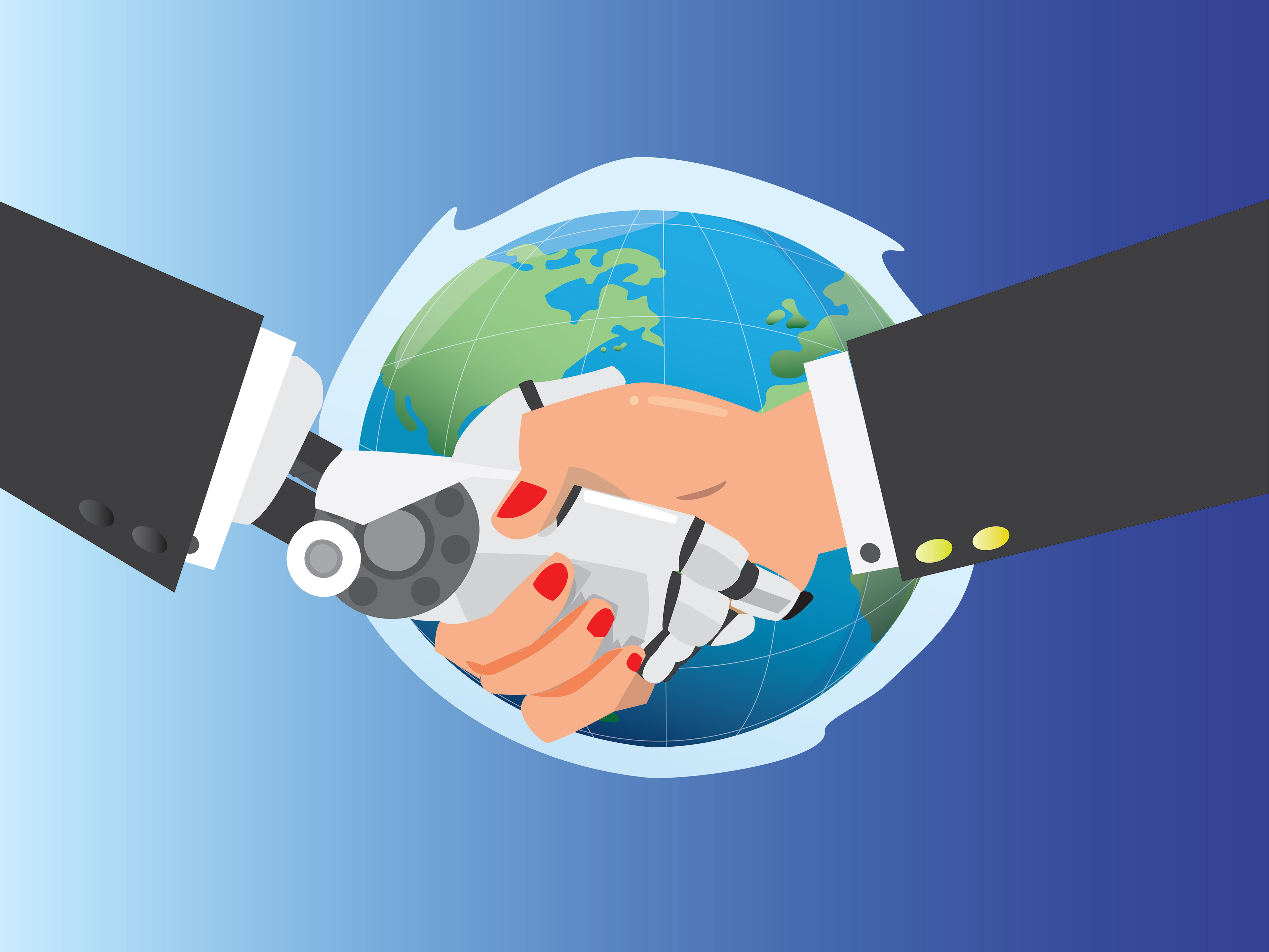 I then created the illustration with the idea of humanity and robots joining hands as a peaceful launch of the projected future relationships humans will have with technology, working as a team.