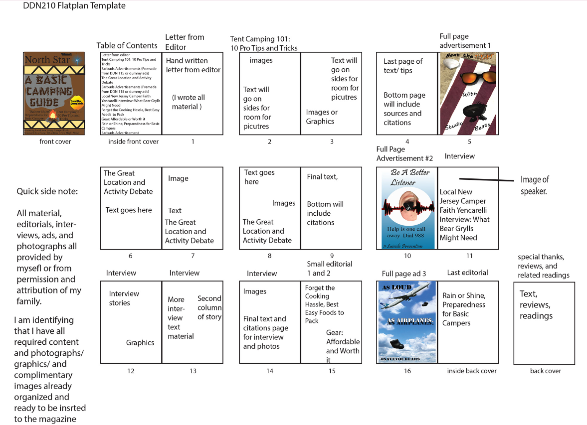 I was thrilled when I was tasked with creating a magazine on any topic I desired (so long as it was appropriate of course) designed for the printing process and creating a digital copy. For my topic, I chose to design the magazine as a how to guide with the intention of sharing personal camping stories drafted from myself and my family members. I designed each page to industry standard in accordance to the project specifications and overall goal of developing a professional grade magazine.