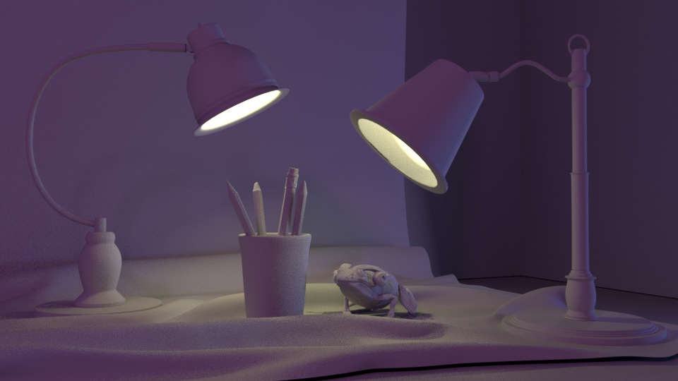 Night time was the most fun lighting so far- my goals was to create a lighting similar to a deep midnight or like a nostalgic dreamy kind of dark. Thus, I used a lot of purple shades, yellows, blues, and slight greens for around the lamp. The first frame was too bright. The second scene felt a lot better but had too much noise/pixelation. The last frame felt just right where you could see the bulb in the lamp for a further sense of realness.