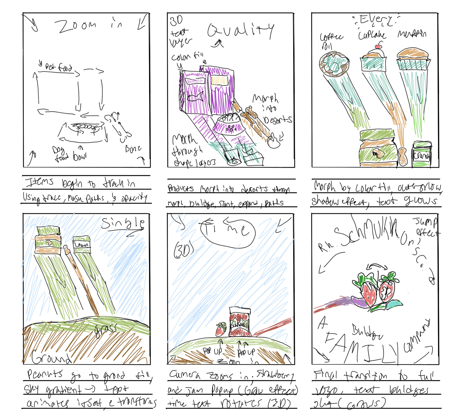 After generating a solid concept and proof of that concept, I took the second style board forward as the main focus of the video as it felt like a really complete design that included all the products from pet food and toys to bakery items to the iconic jam and peanut butters. Next, I took to Illustrator to create the graphic assets and export the layers for animation in After Effects.