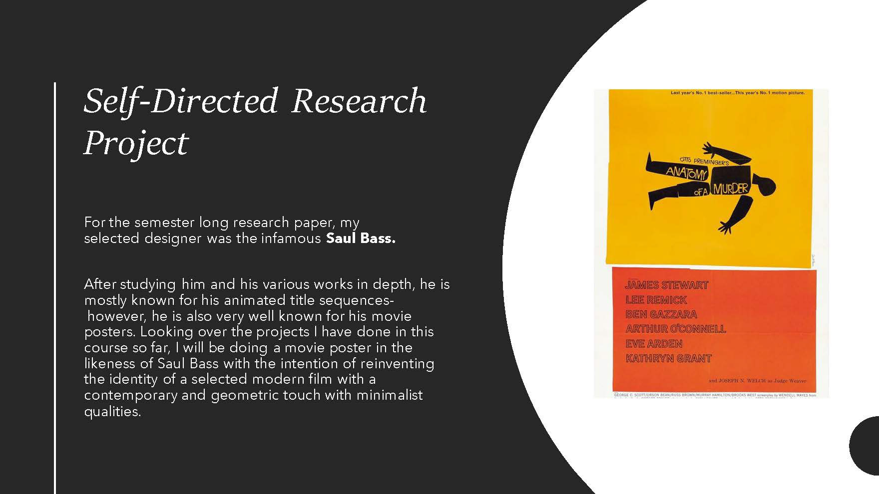 I first started the assignment by researching all the kinds of works Saul Bass did and began identifying what made his posters successful and the key traits that made his works Identifiable.