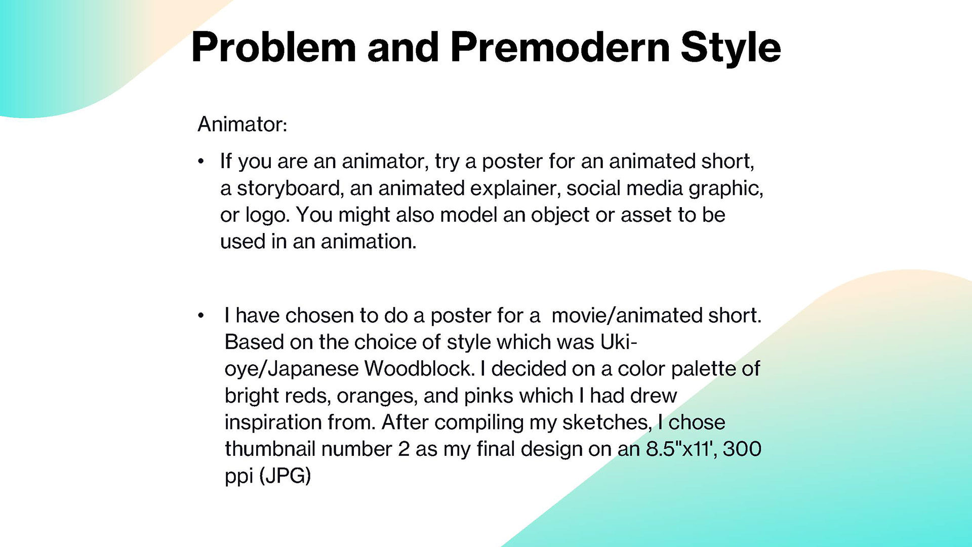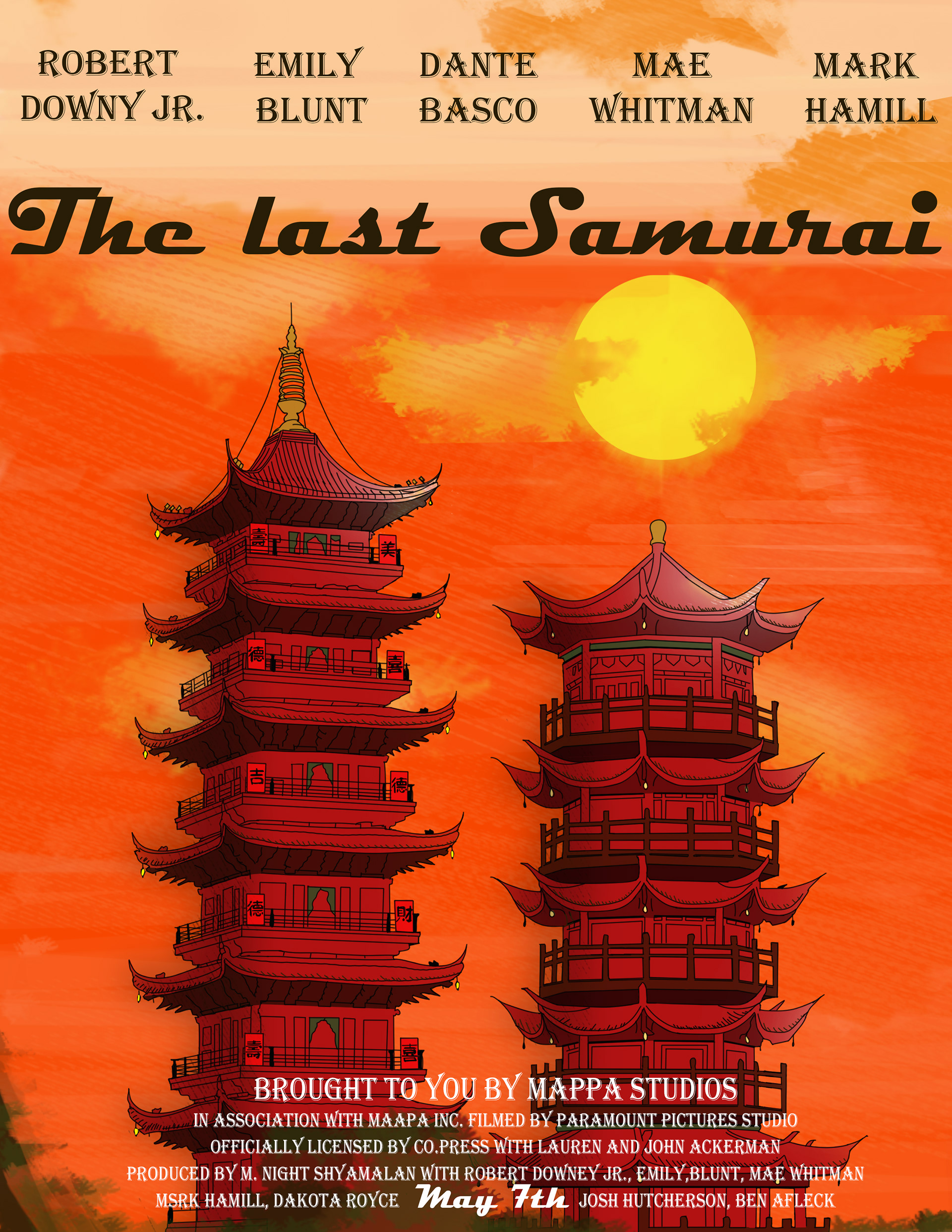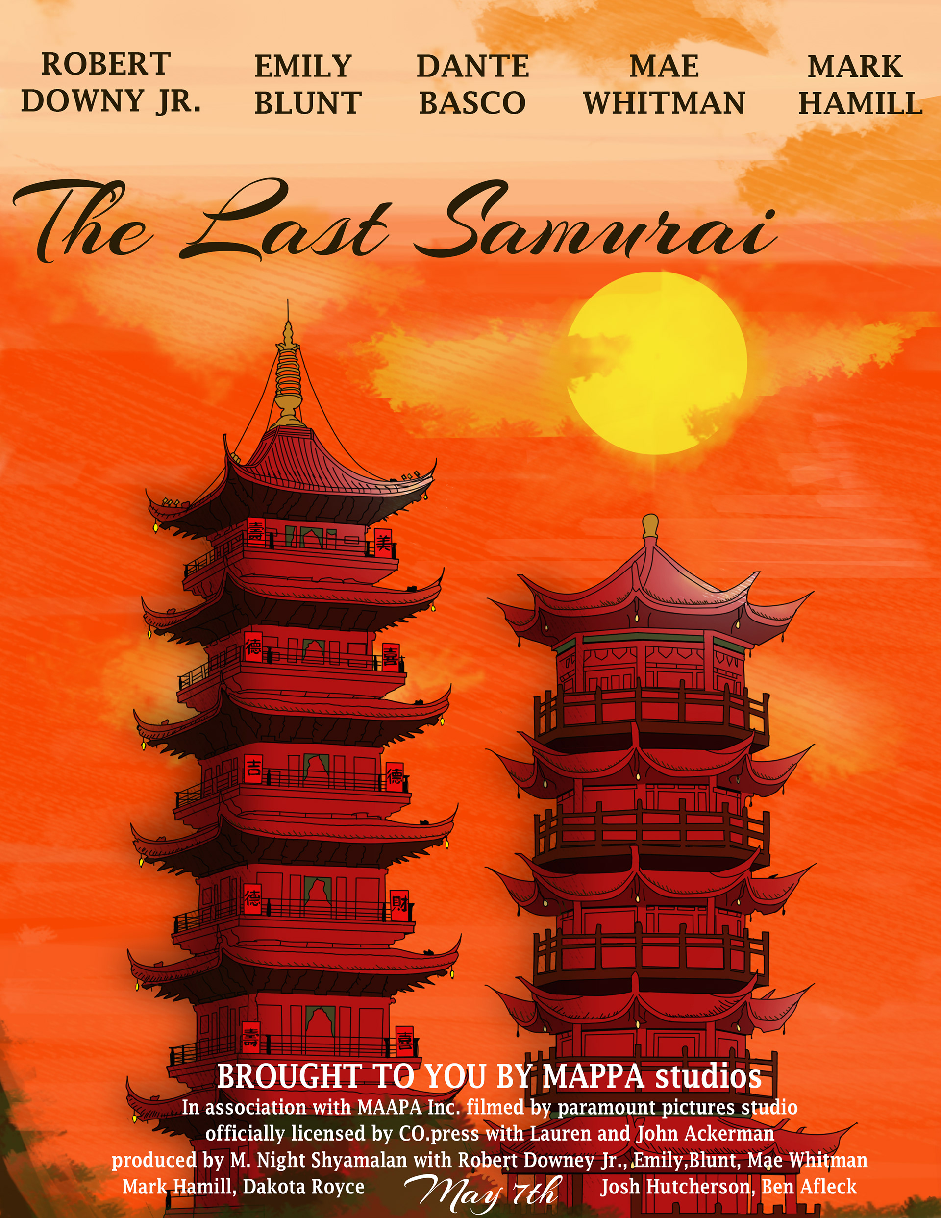 For this project, the primary goal was to combine a historical aesthetic and choose to do a project (short animation, poster, social media ad and so forth) utilizing industry standard programs such as Adobe Photoshop, Illustrator, and InDesign. For this poster, I chose to do a traditional style of 17th century Japanese art, Ukiyo-e woodblock print to advertise a fictitious movie, "The Last Samurai". Another goal of the project was to utilize modern design principles effectively with both graphic or typographically elements.