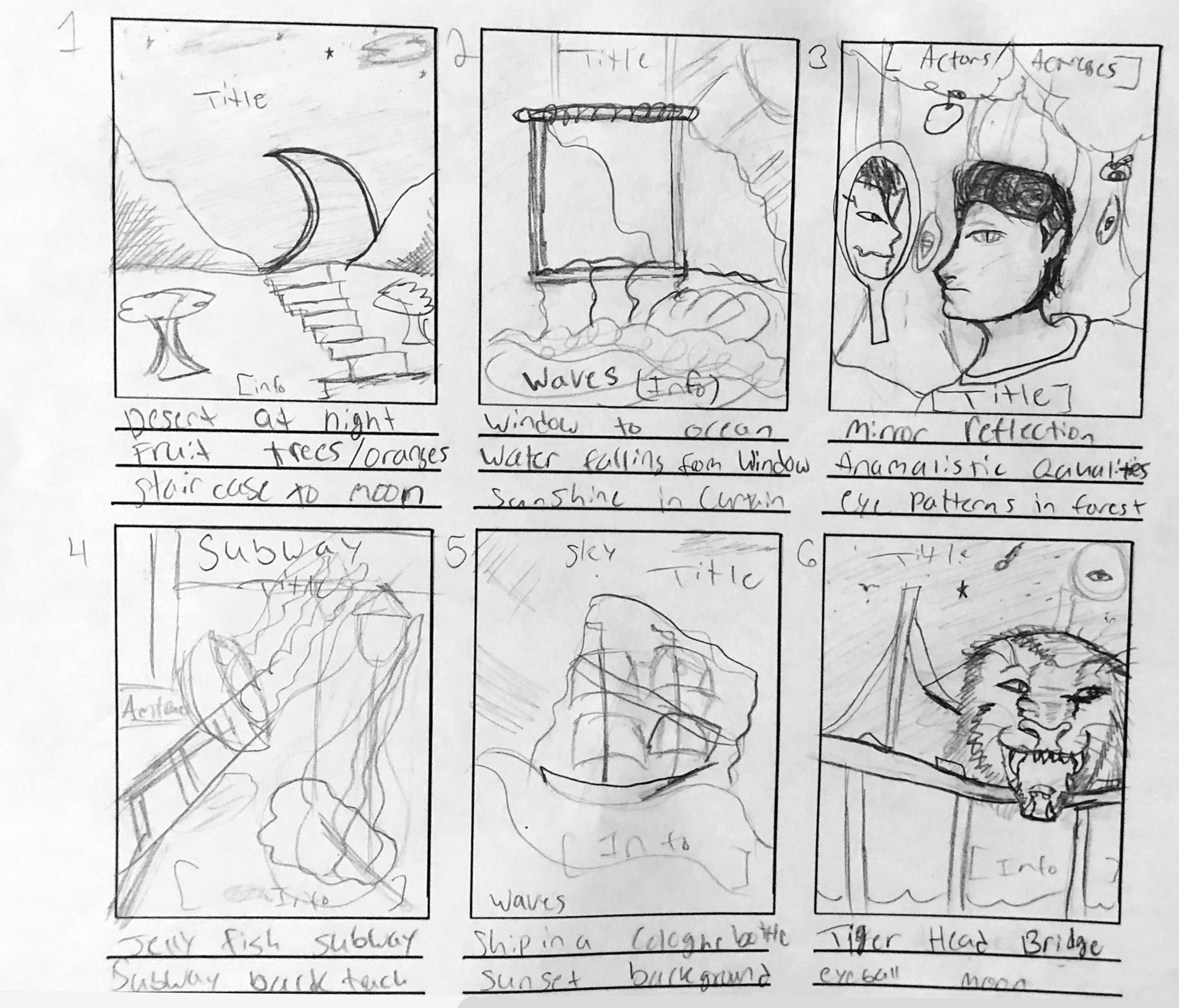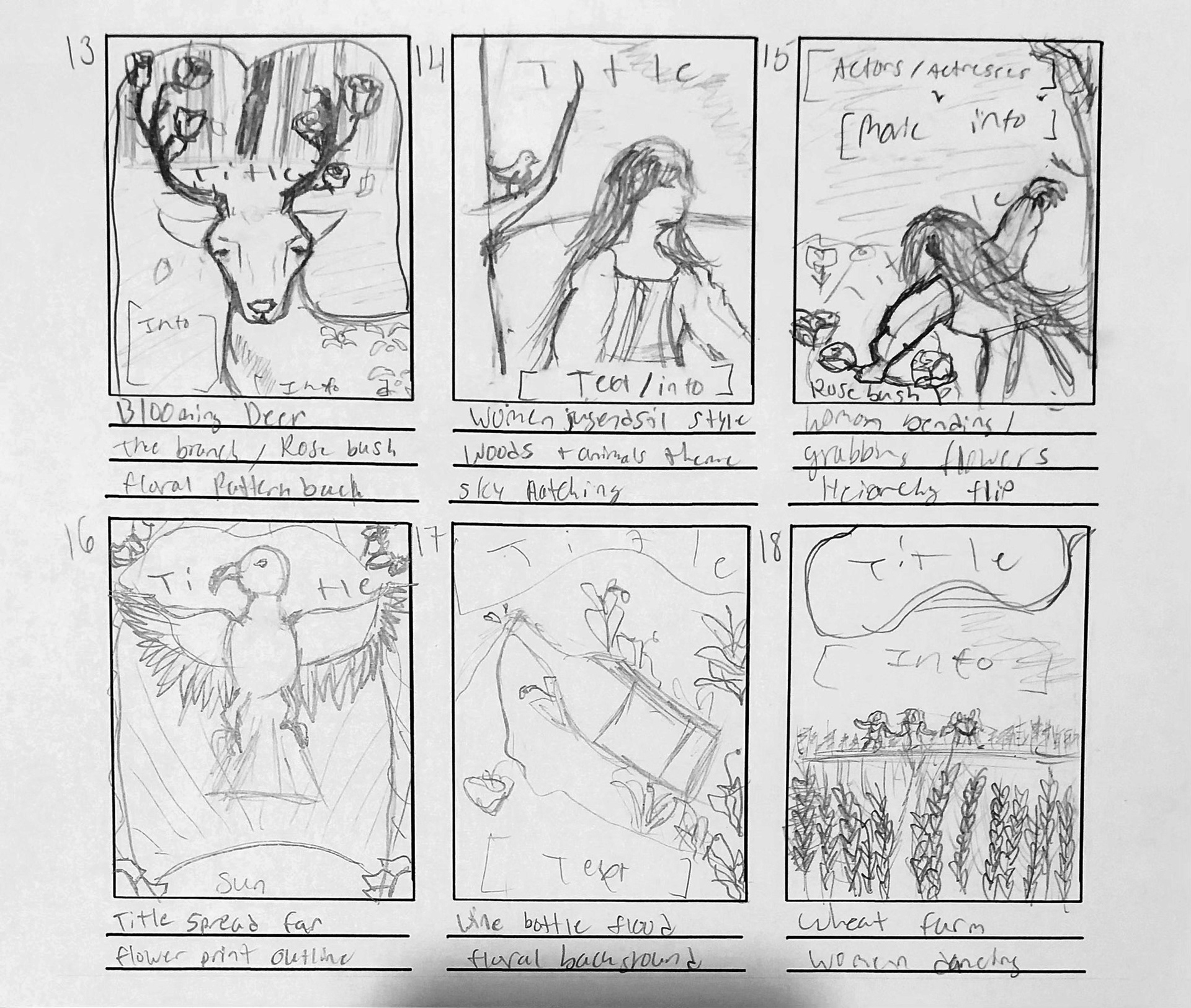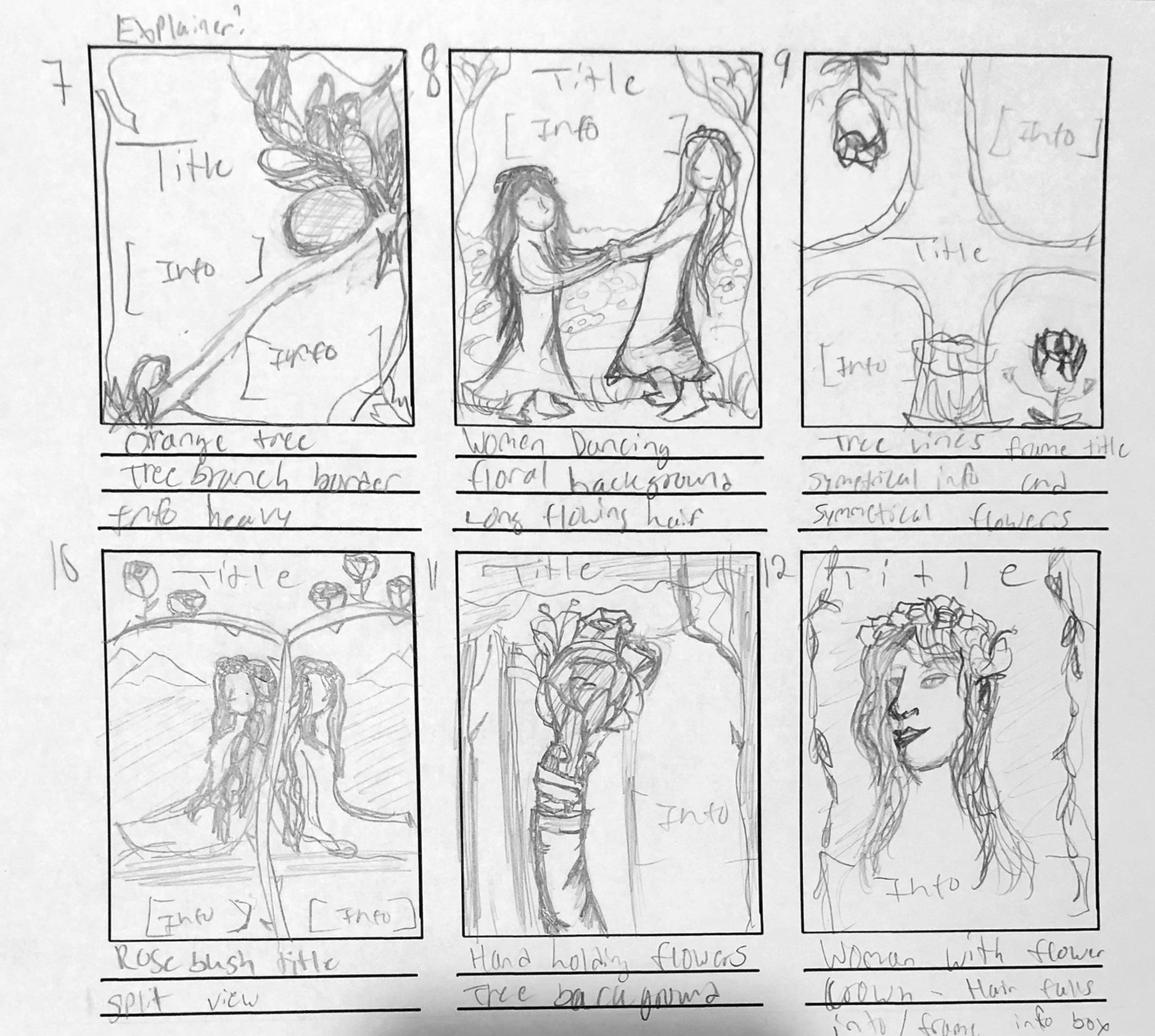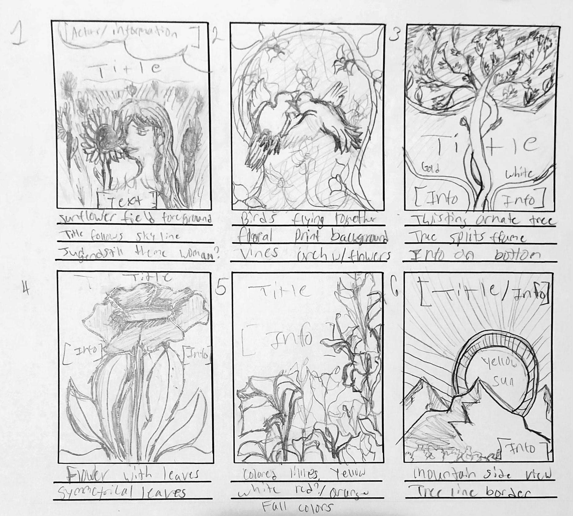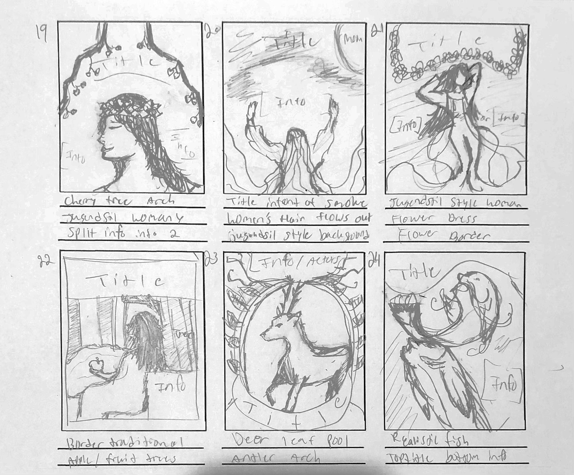 I began sketching out thumbnails of at least twenty four ideas based on some research on German Jugendstil posters that I had seen from magazines around the 1900's. I decided on thumbnail five as my best design.