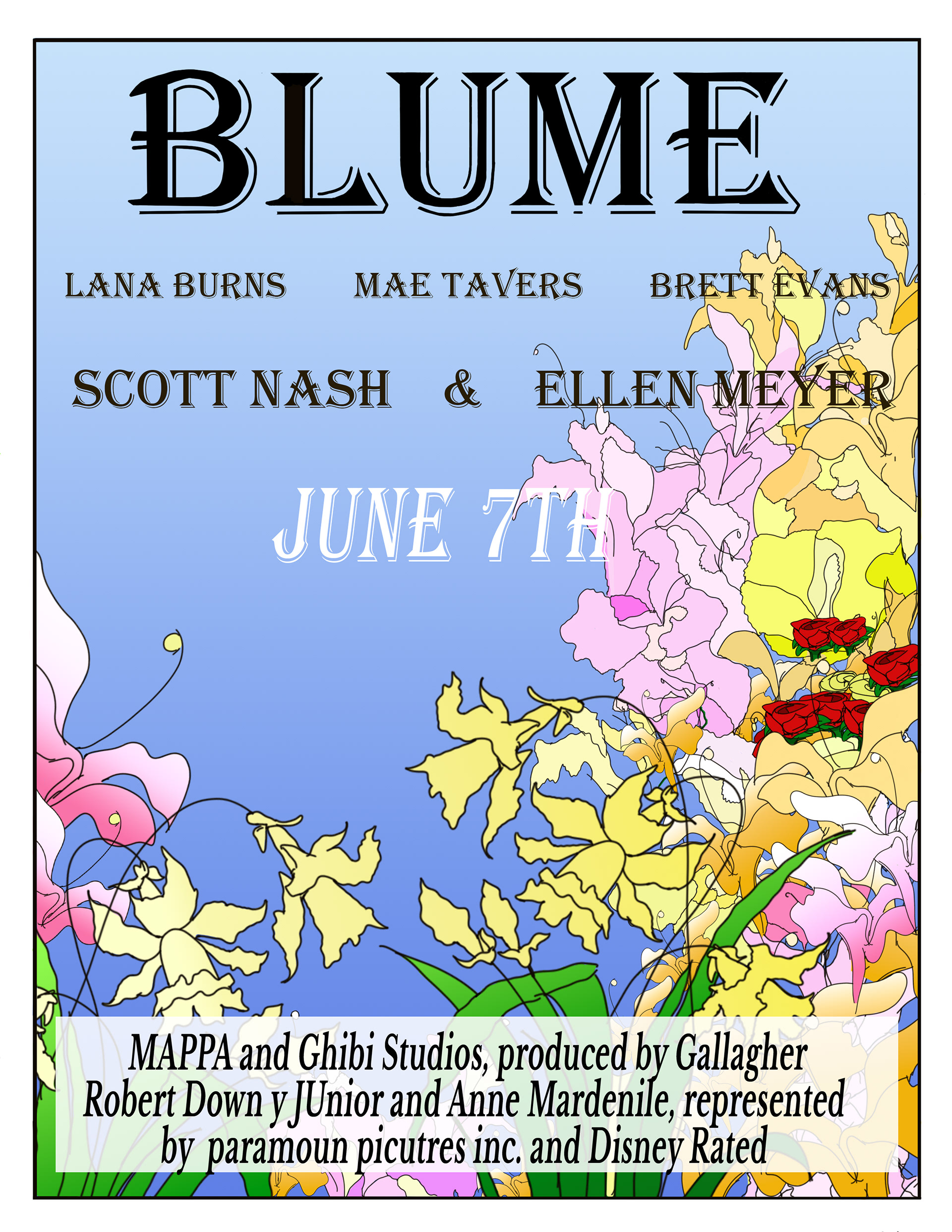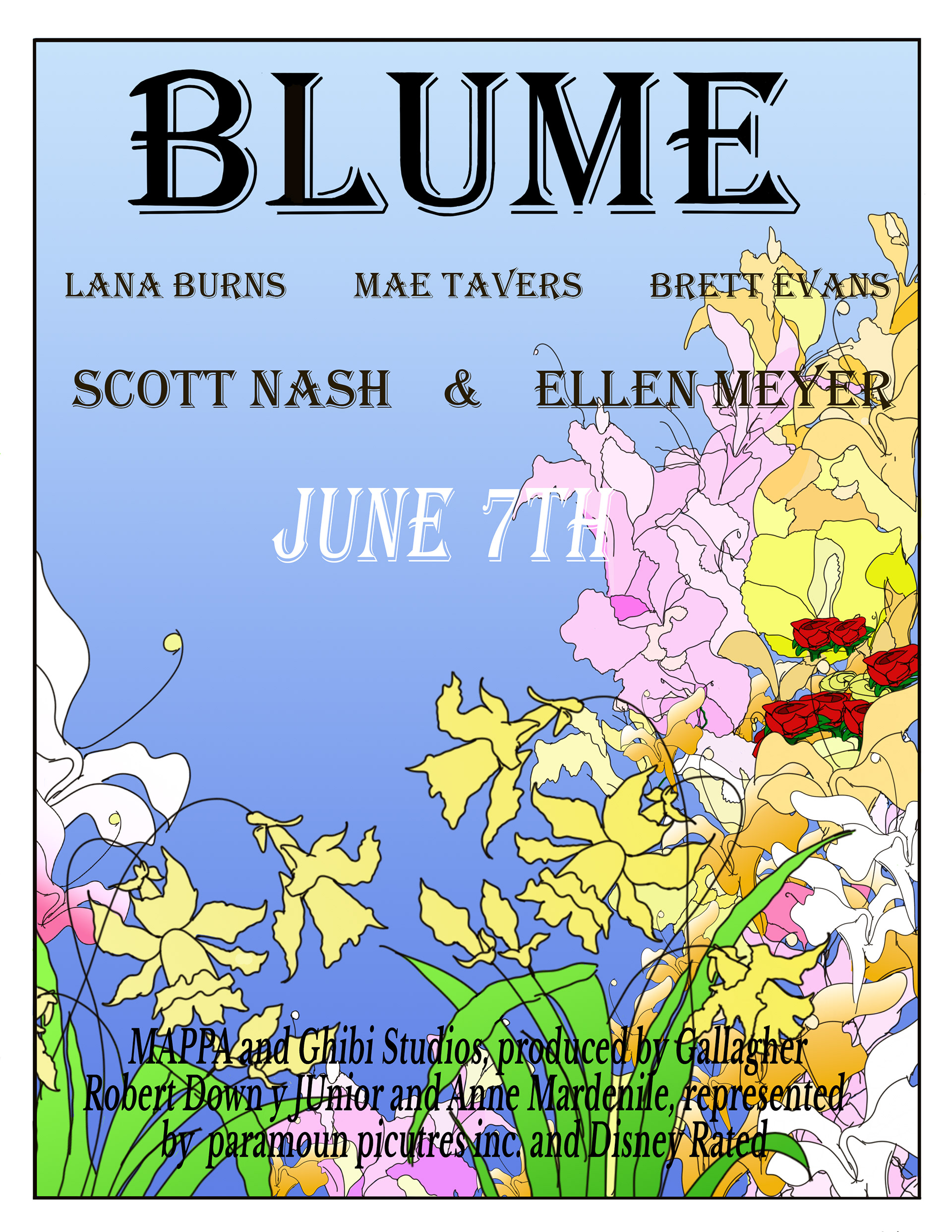 The first design came out well as I continued my hand-drawn style of the flowers, water lilies, and even the featuring main title "Blume". The only main issue with this pass was the black text on the bottom was difficult to read.