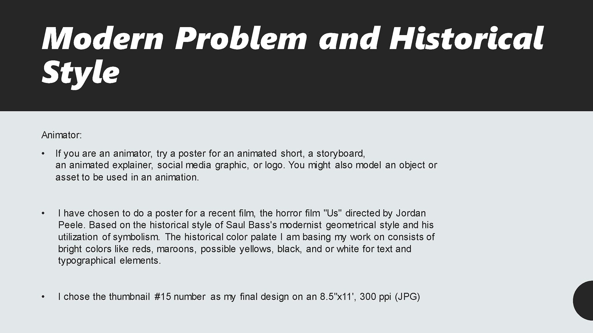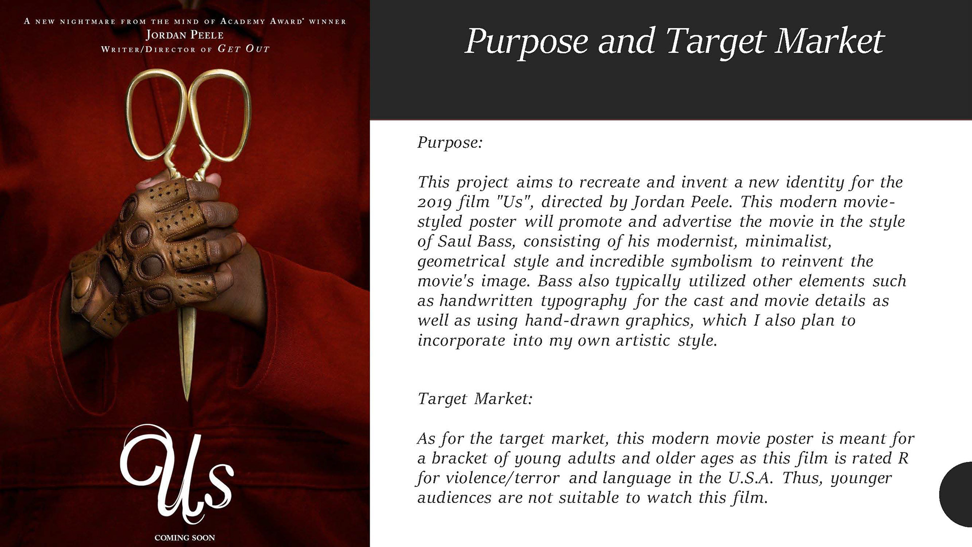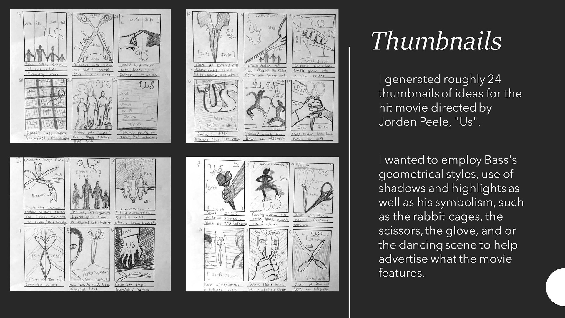 For this project, a self-conducted research portion was to combine with a creation based off of or inspired by the selected research subject (Saul Bass). After compiling research in the artist, the assignment was to a project (short animation, poster, social media ad and so forth) utilizing industry standard programs such as Adobe Photoshop, Illustrator, and InDesign. For this poster, I chose to do a real modern movie "Us" by Jordan Peele in the style and likeness of Saul Bass.