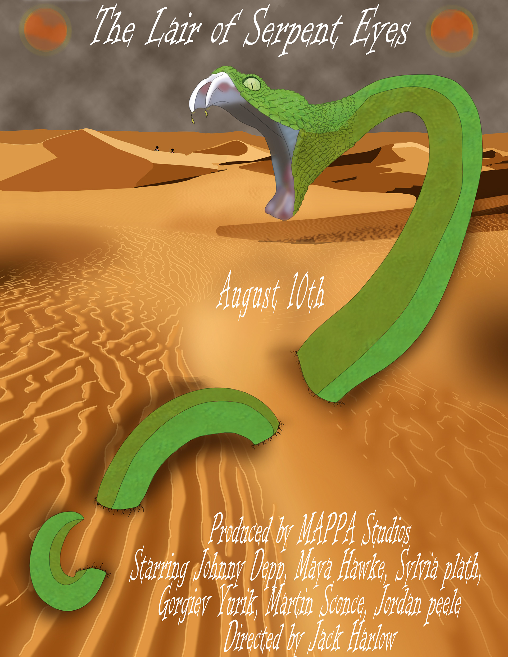 This was the final design, a giant serpent coming out of the sand dunes with strange figures watching in the background. I hand drew the snake and its painstaking pattern, I also used a combination of masks, blur effects, and fractal noise to complete the background.