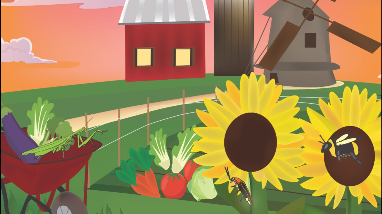 This project features a cycle animation of a praying mantis, bumble bee, and lightning bug made from just letters, interacting in a garden scene.