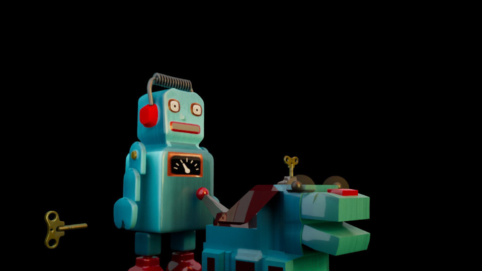 3D animated and composited title sequences featuring 3D animation, modeling, texturing, and rending composited in real time footage of a robot and his trusty dog.