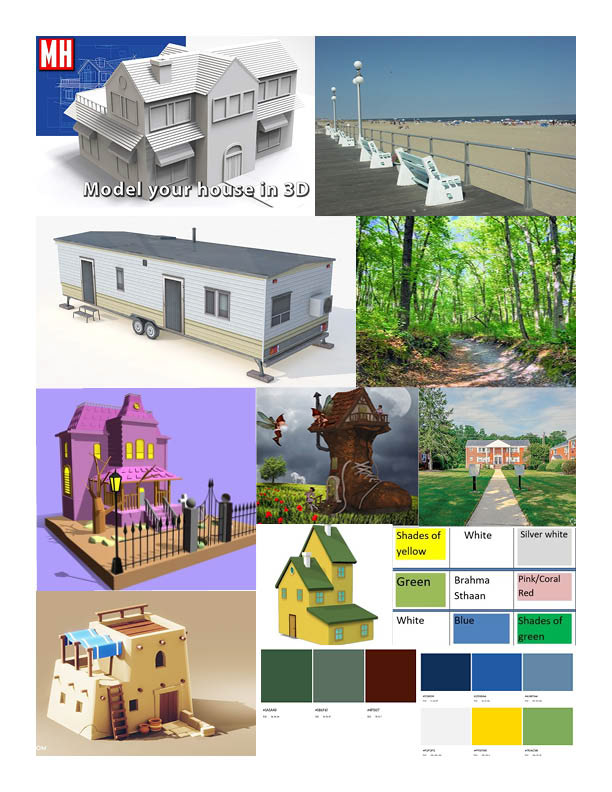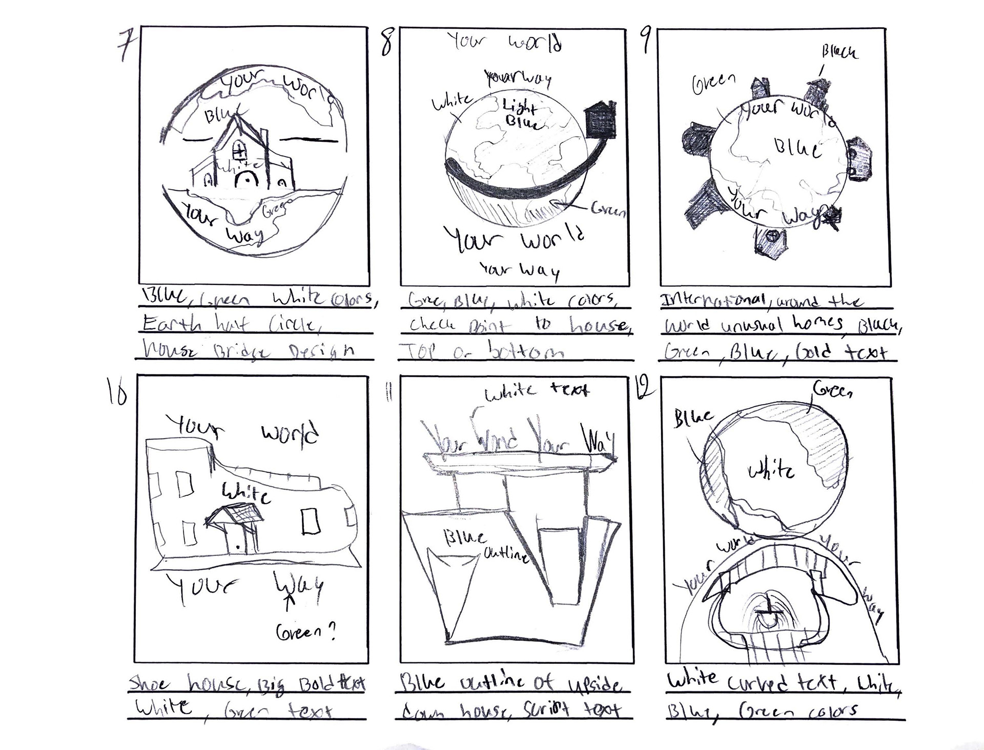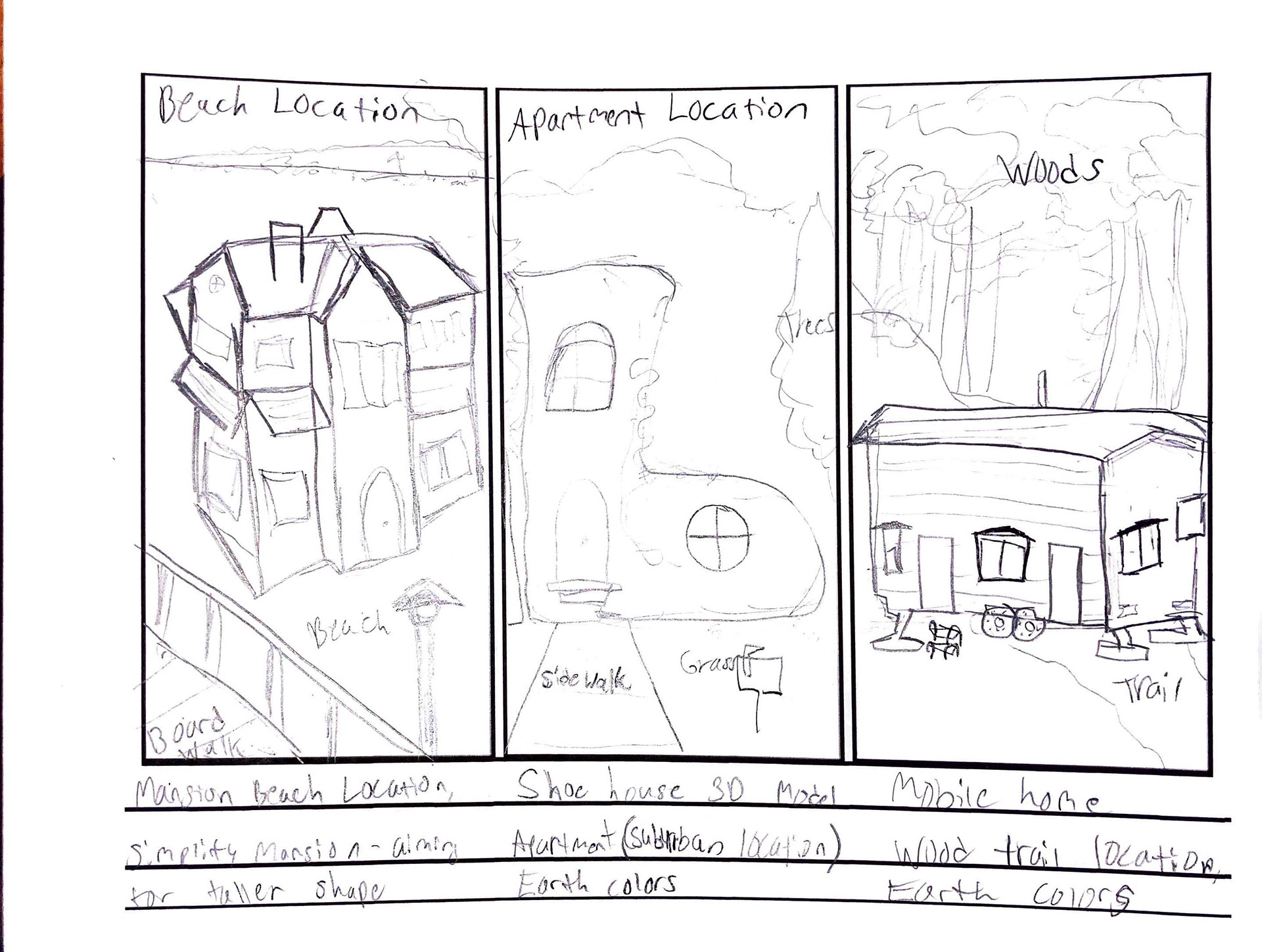 After configuring several designs, I chose the number eight panel as the best design that made the most sense, looked the cleanest, and did not have too many intricate details that would convert awkwardly between the 3D software Maya. I then went to create a storyboard to further cement the possible choices of location as this was another large portion of the project- collecting good footage by hand. This would help me envision where and how I could put the logo into the scenes and what types of houses would be appropriate for the location.